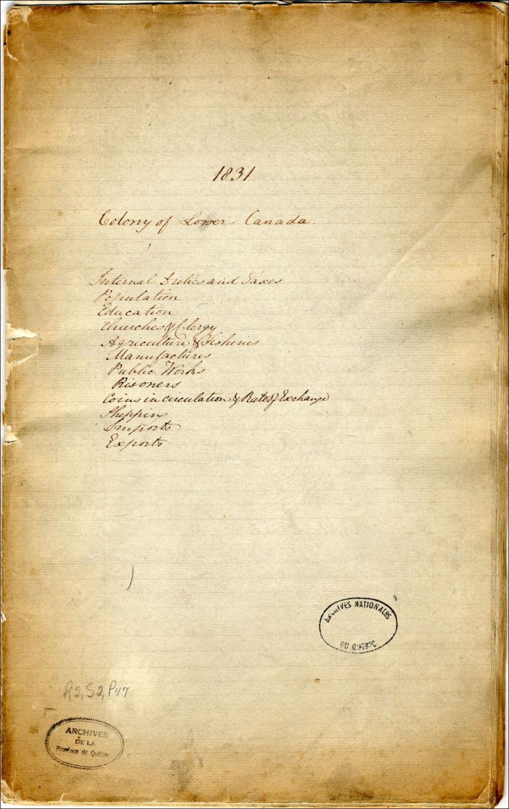 Statistiques intitulés "Colony of Lower Canada: 1831 [contient des renseignements sur les revenus publics, l'éducation, les églises et chapelles, la population, , l'agriculture, les pêcheries, travaux publics en cours de construction ou de réparation incluant les routes et les ponts, les prisonniers, la monnaie, les poids et mesures et les navires arrivés au Bas-Canada, 1831, Archives nationales à Québec, Fonds Gouverneurs, régime anglais, (03Q,R2,S2,P47).