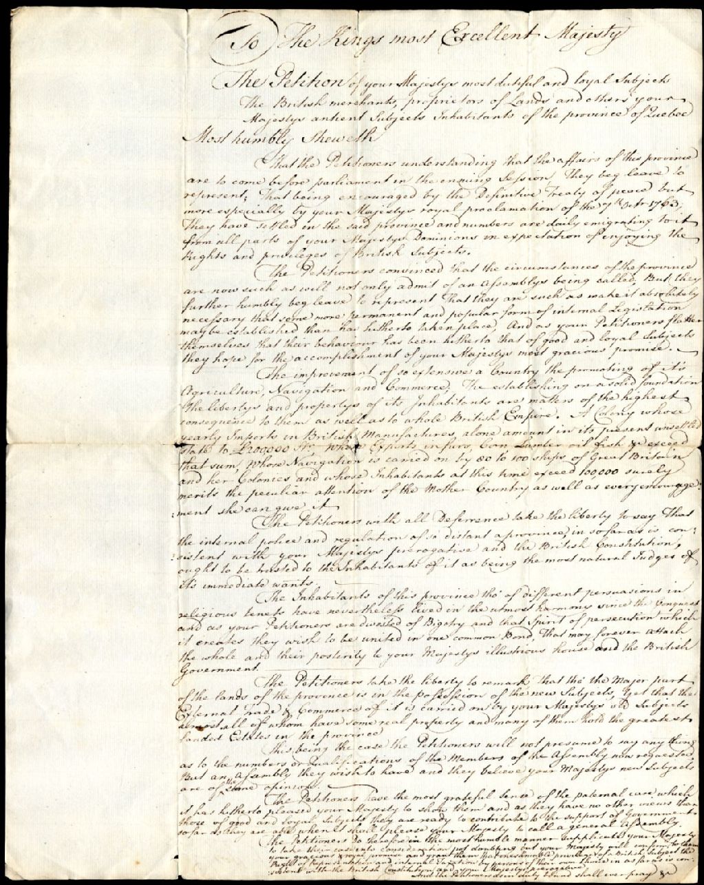 Brouillon d'une pétition des marchands britanniques, propriétaires de terre et autres anciens sujets demeurant dans la province de Québec adressée au roi, pour l'obtention de privilèges étant donné qu'ils sont des sujets britanniques de pure souche. «A Colony whose yearly Imports in British manufactures alone amount in its present unsettled state to £200,000 Str., Whose Exports in furs, Corn, Lumber oil fish &c exceed that sum, Whose Navigation is carried on by 80 to 100 ships of Great Britain and her Colonies and whose Inhabitants at this time exceed 100,000 ...». Demande une Chambre d'assemblée (Parlement), 2 novembre 1773, Archives nationales à Québec, Fonds Gouverneurs, régime anglais, (03Q,R2,S2,P5).