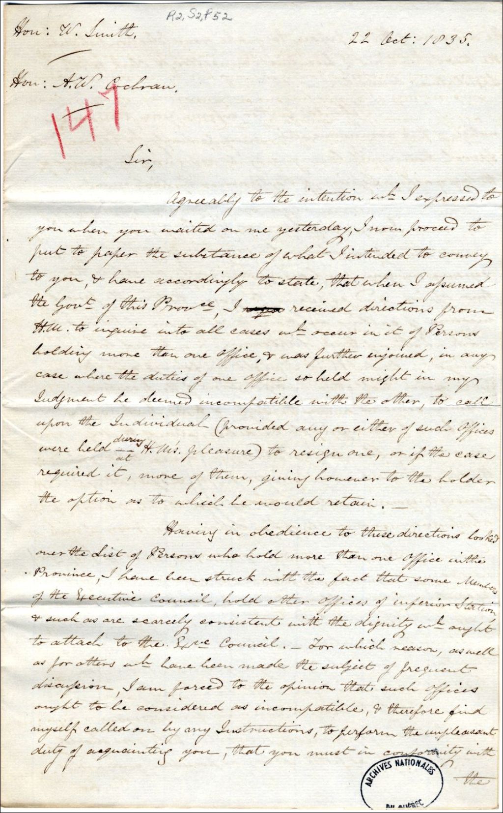 Lettre du gouverneur Archibald Acheson, comte de Gosford, à W. Smith. Il a reçu l’ordre de Sa majesté, de s’enquérir si des officiels du gouvernement du Bas-Canada ne retiennent pas plusieurs positions à la fois. Comme il s’est aperçu que monsieur Smith est en même temps membre du Conseil exécutif et greffier du Conseil législatif, il le prie de résigner l’une ou l’autre de ces fonctions. Même lettre à l’honorable A. W. Cochrane, 22 octobre 1835, Archives nationales à Québec, Fonds Gouverneurs, régime anglais, (03Q,R2,S2,P52).