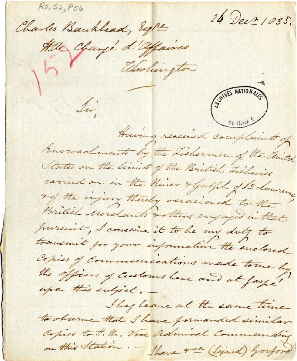 Lettre du gouverneur Archibald Acheson, comte de Gosford, à Charles Bankhead, chargé d’affaires à Washington. Il lui envoie les documents concernant les empiètements des pêcheurs américains, dans le golfe Saint-Laurent, 26 décembre 1835, Archives nationales à Québec, Fonds Gouverneurs, régime anglais, (03Q,R2,S2,P56).