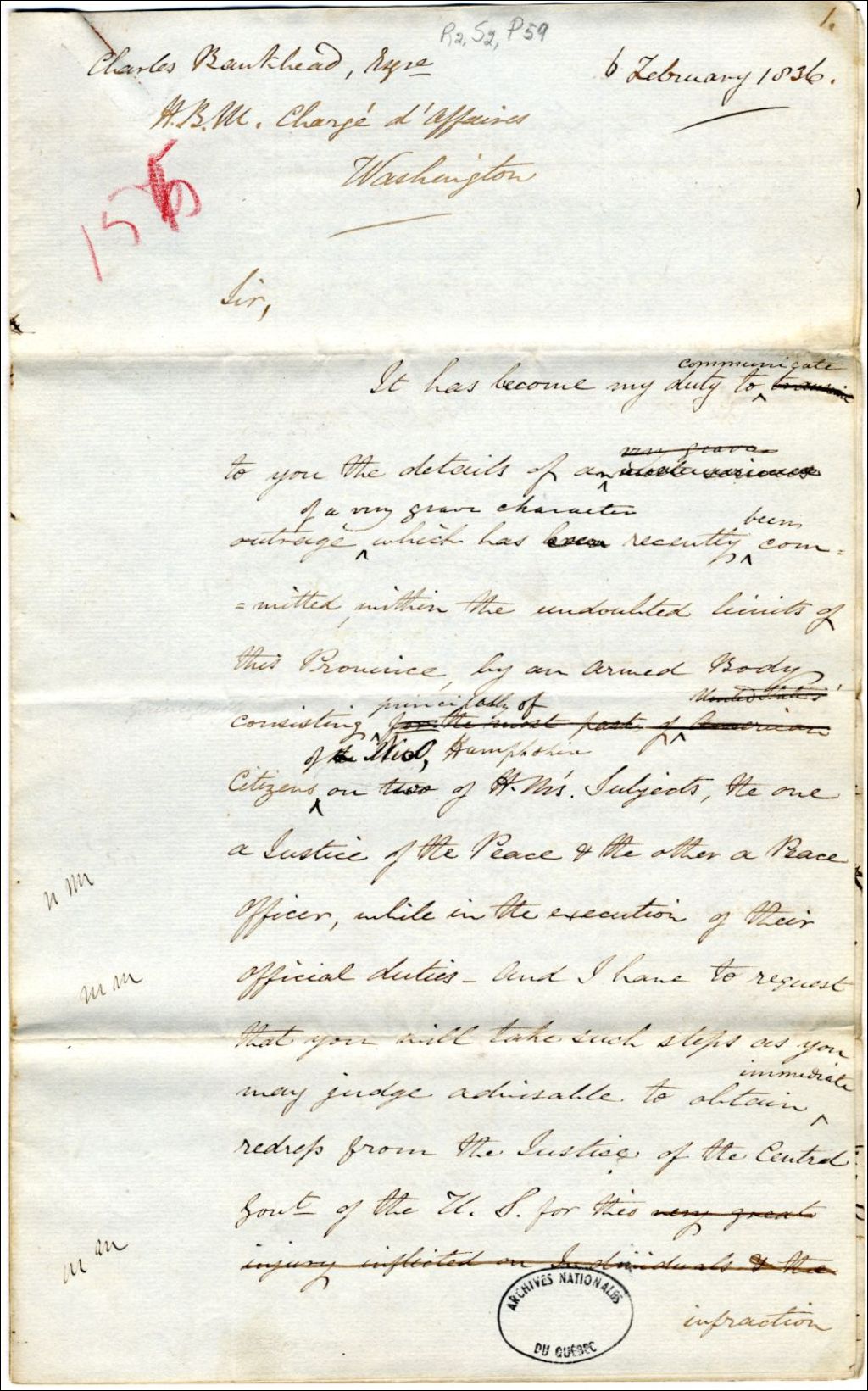 Lettre du gouverneur Archibald Acheson, comte de Gosford, à Charles Bankhead, chargé d’affaires à Washington. À propos de l’invasion d’une troupe d’Américains qui ont envahi le canton de Drayton à l’Indian Stream Territory et qui ont enlevé des mains de W. Smith, John Melton, Harvey et Richard J. Blanchard qui avaient arrêté, sous un mandat d’arrestation émis par le shérif de Coos, New-Hampshire, un nommé John Tyler. Ces Américains étaient armés et sous la conduite d’un officier de l’armée américaine, ce qui est une grave infraction au traité de paix existant entre l’Angleterre et les États-Unis, 6 février 1836, Archives nationales à Québec, Fonds Gouverneurs, régime anglais, (03Q,R2,S2,P59).