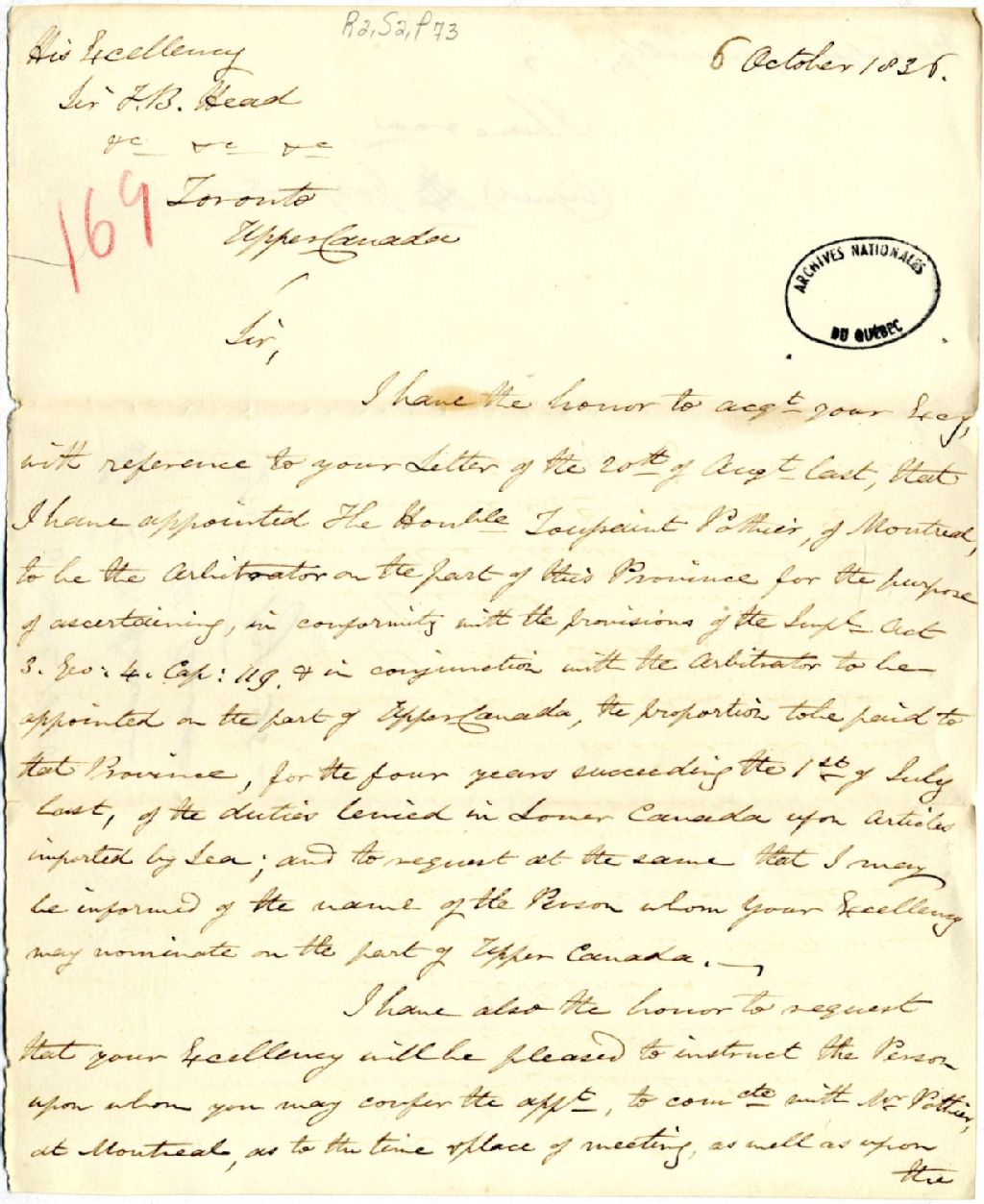 Lettre du gouverneur Archibald Acheson, comte de Gosford, à Sir Francis Bond Head, lieutenant-gouverneur du Haut-Canada. L’honorable Toussaint Pothier a été nommé arbitre pour régler la question des droits de douane à être payés par le Bas-Canada au gouvernement du Haut-Canada, sur les articles importés d’outre-mer, 6 octobre 1836, Archives nationales à Québec, Fonds Gouverneurs, régime anglais, (03Q,R2,S2,P73).