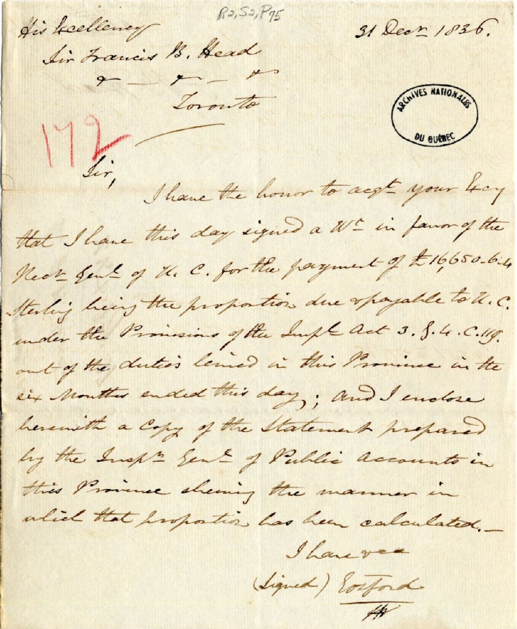 Lettre du gouverneur Archibald Acheson, comte de Gosford, à sir Francis Bond Head, lieutenant-gouverneur du Haut-Canada. Il a signé un mandat de 16 650 livres 6 shillings 4 pences étant la proportion des droits de douane dus par le gouvernement du Bas-Canada à celui du Haut-Canada, 31 décembre 1836, Archives nationales à Québec, Fonds Gouverneurs, régime anglais, (03Q,R2,S2,P75).