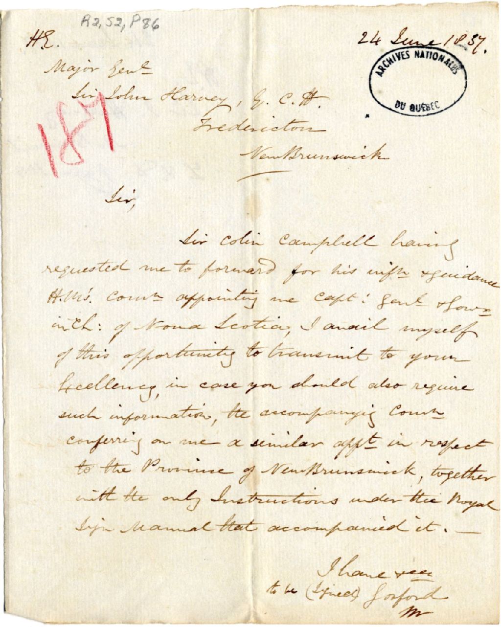Lettre du gouverneur Archibald Acheson, comte de Gosford, à Sir John Harvey, Frédéricton. Il lui envoie sa commission de gouverneur et capitaine général du Nouveau-Brunswick, 24 juin 1837, Archives nationales à Québec, Fonds Gouverneurs, régime anglais, (03Q,R2,S2,P86).