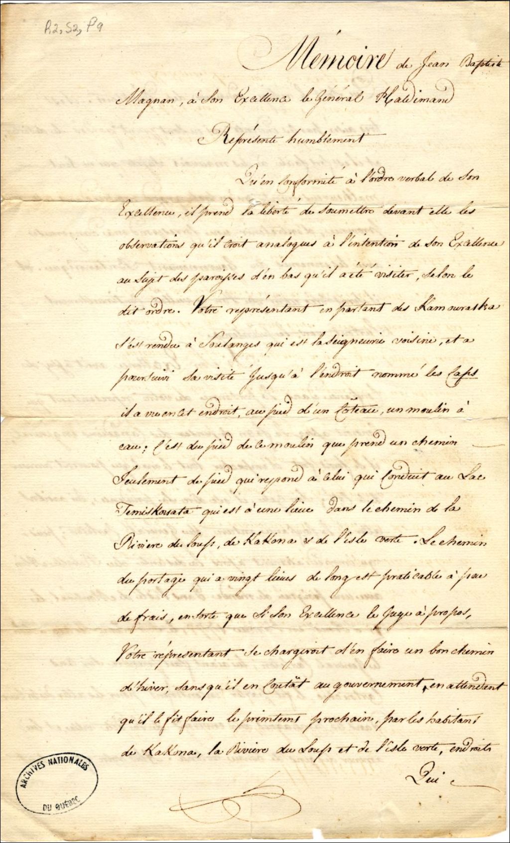 Compte-rendu de Jean-Baptiste Magnan [grand voyer du district de Québec] au gouverneur Frédérick Haldimand concernant des visites faites par Magnan au sujet des paroisses d'en bas - Kamouraska, Kakona (Cacouna), Rivière-du-Loup, Isle-Verte - ainsi que la construction du chemin du Portage sur 20 lieues qui conduit au lac Témiskouata (Témiscouata). À l'endroit nommé les Caps, au pied d'un côteau, est un moulin à eau où prend un chemin seulement de pied qui est à une lieue dans le chemin de la Rivière-du-Loup, de Cacouna et de l'Île Verte. Le chemin du Portage qui a vingt lieues de long est praticable à peu de frais. Magnan peut en faire un bon chemin d'hiver en attendant que qu'il le fît faire le printemps prochain par les habitants de la Rivière-du-Loup, de Cacouna et de l'Île Verte, endroits qui sont le refuge ordinaire des déserteurs. Rappelle ses états de service le 25 août 1775 sur l'île de Montréal lors de l'invasion américaine de 1775., 17 novembre 1780, Archives nationales à Québec, Fonds Gouverneurs, régime anglais, (03Q,R2,S2,P9).