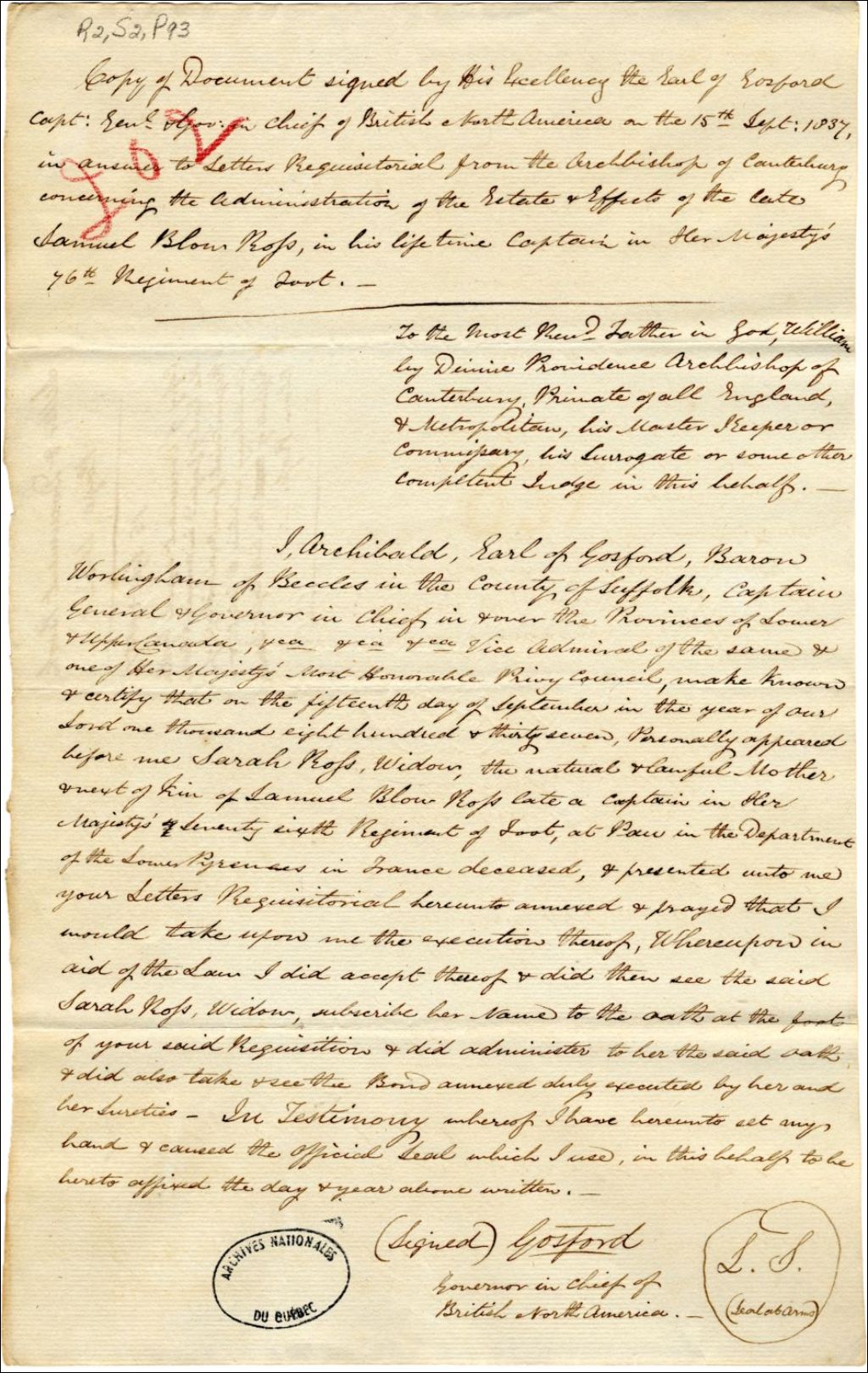 Affidavit du gouverneur Archibald Acheson, comte de Gosford, concernant l’administration de la succession et des biens de feu Samuel Blow Ross, capitaine dans le 76e régiment d'infanterie, 15 septembre 1837, Archives nationales à Québec, Fonds Gouverneurs, régime anglais, (03Q,R2,S2,P93).