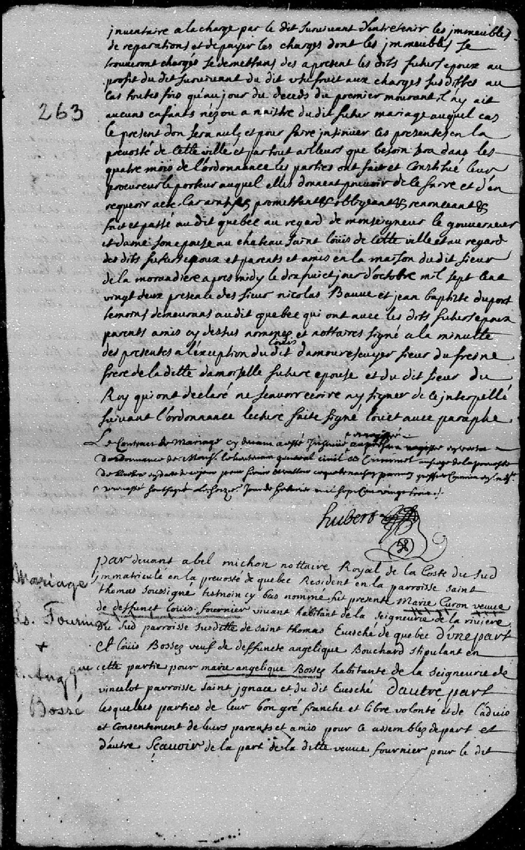 Contrat de mariage passé pardevant Abel Michon, notaire royal de la côte du Sud, entre Louis Fournier, fils de feu Louis Fournier, vivant habitant de la seigneurie de la Rivière-du-Sud, paroisse de Saint-Thomas, évêché de Québec, et de Marie Caron (Curon); et Marie-Angélique Bossé, habitante de la seigneurie de Vincelotte, paroisse Saint-Ignace, fille de feue Angélique Bouchard et de Louis Bossé