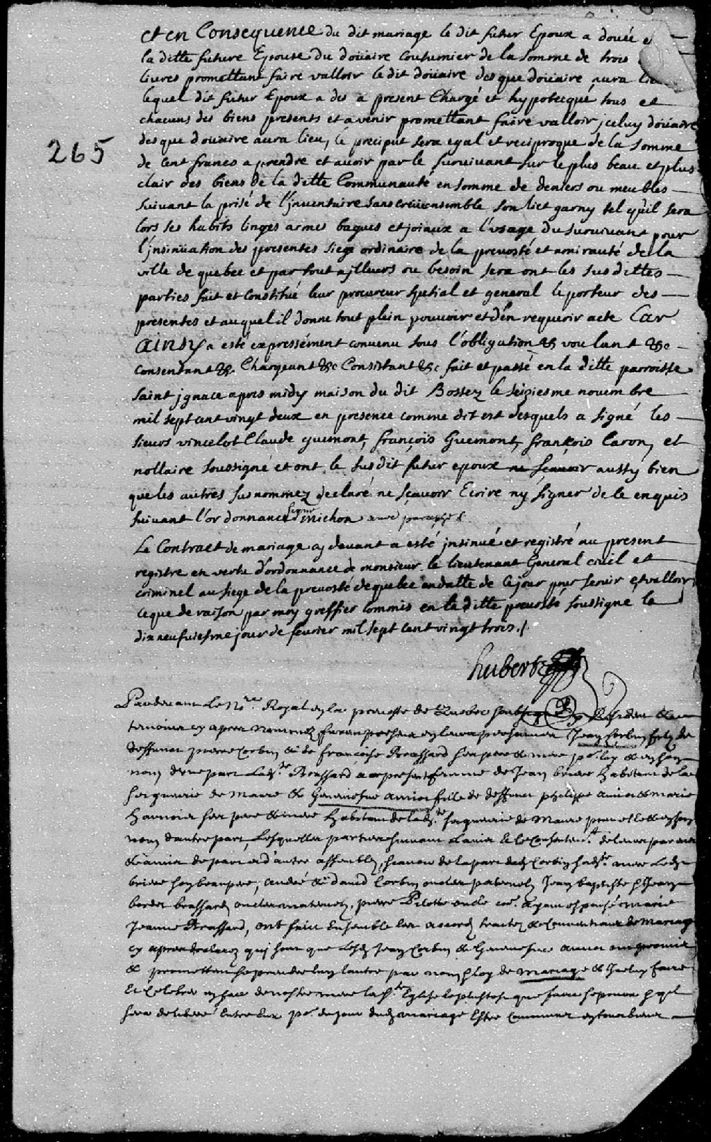 Contrat de mariage passé pardevant maître Dubreuil, notaire royal en la Prévôté de Québec, entre Jean Corbin, fils de défunt Pierre Corbin et de Françoise Brassard, à présent femme de Jean Brière, habitant de la seigneurie de Maur; et Geneviève Amiot (Amyot), fille des défunts Philippe Amiot et Marie Harnois, ses père et mère