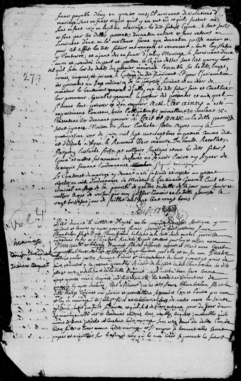 Contrat de mariage passé pardevant maître Dubreuil, notaire royal en la Prévôté de Québec, entre Simon Chamberland, fils de Simon Chamberland, habitant de la côte Saint-Michel, paroisse Notre-Dame-de-Foy, et d'Élisabeth Rondeau, ses père et mère; et Thérèse Ouimet, fille des défunts [Louis] Ouimet et Marie-Anne Genest (Genet), de leur vivant habitants de l'île et comté Saint-Laurent (île d'Orléans)