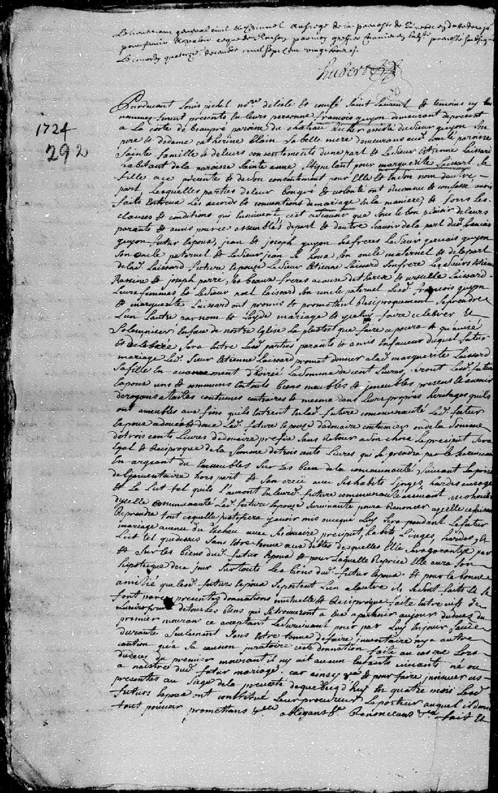 Contrat de mariage passé pardevant Louis Pichet, notaire royal en l'île et comté de Saint-Laurent (île d'Orléans), entre François Guyon, demeurant en la côte de Beaupré, paroisse de Château-Richer, fils de [Claude] Guyon, époux en secondes noces de Catherine Blain (Blouin), ses père et belle-mère, demeurant audit comté de Saint-Laurent, paroisse Sainte-Famille; et Marguerite Lessard, fille d'Étienne Lessard, habitant de la paroisse Sainte-Anne