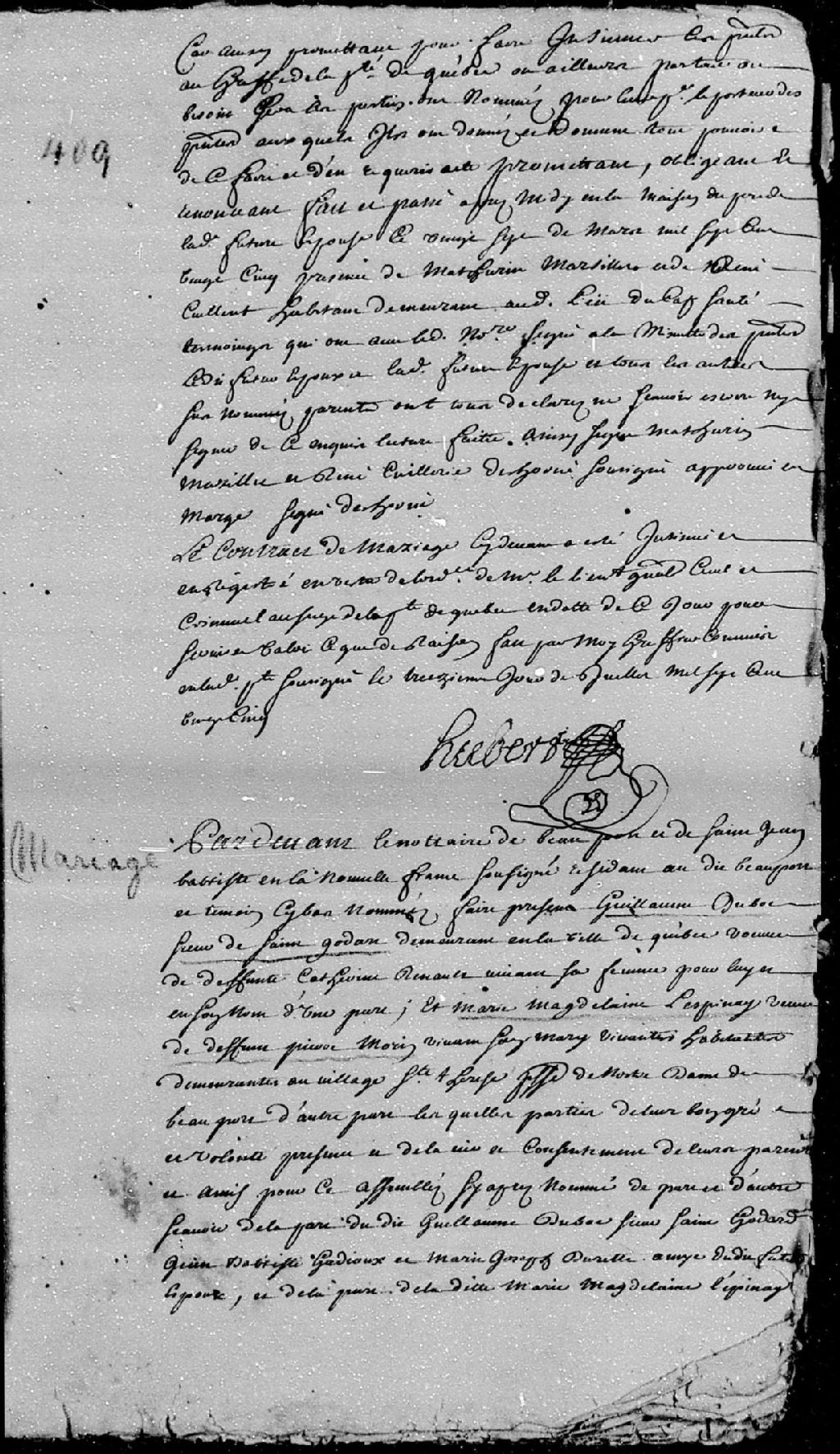 Contrat de mariage passé pardevant maître Duprac (Duprat - Dupras), notaire royal de Beauport et Saint-Jean-Baptiste, entre Guillaume Duboc dit Saint-Godard, demeurant en la ville de Québec, veuf de feue Catherine Renaud; et Marie-Madeleine Lespinay (Lépinay), habitante demeurant au village Sainte-Thérèse, paroisse Notre-Dame-de-Beauport, veuve de feu Pierre Morin
