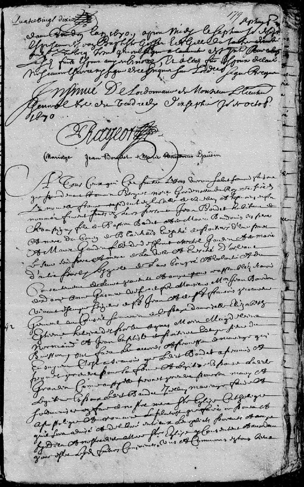 - La pièce se compose du mariage entre Jean Boudet (Beaudet), habitant de Champigny, fils de Bastien (Sébastien) Boudet (Beaudet) et de Marie Baudouin (Baudonier), ses père et mère du bourg de Blaichais (Blanzay) en l'évêché de Poitiers, et Marie Gaudin (Grandin), fille du feu Michel Gaudin (Grandin) et de Marie LeJeune, ses père et mère de la ville et évêché d'Orléans, sont présent dame Anne Gasnier (Gagné - Gagnier), veuve du feu sieur Jean Bourdon, de son vivant écuyer et seigneur de Saint-Jean et de Saint-François, conseiller au Conseil souverain, demoiselle Élizabeth Étienne, Hélène DesPortes, Agnès Morin, Madeleine Normand et Jean-Baptiste de Poitier (DePoitier), écuyer, sieur du Buisson (DuBuisson), amis des futurs époux, Jean-Baptiste Gosset et Gilles Dutartre, sont témoins.