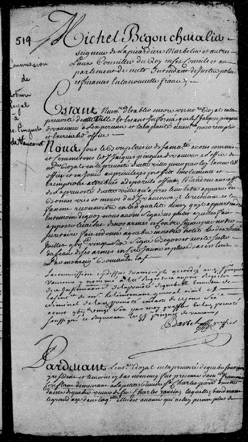 Commission de notaire royal en la Prévôté de Québec accordée à Jacques Pinguet de Vaucour (Vaucours - Vaucourt), par l'intendant Michel Bégon