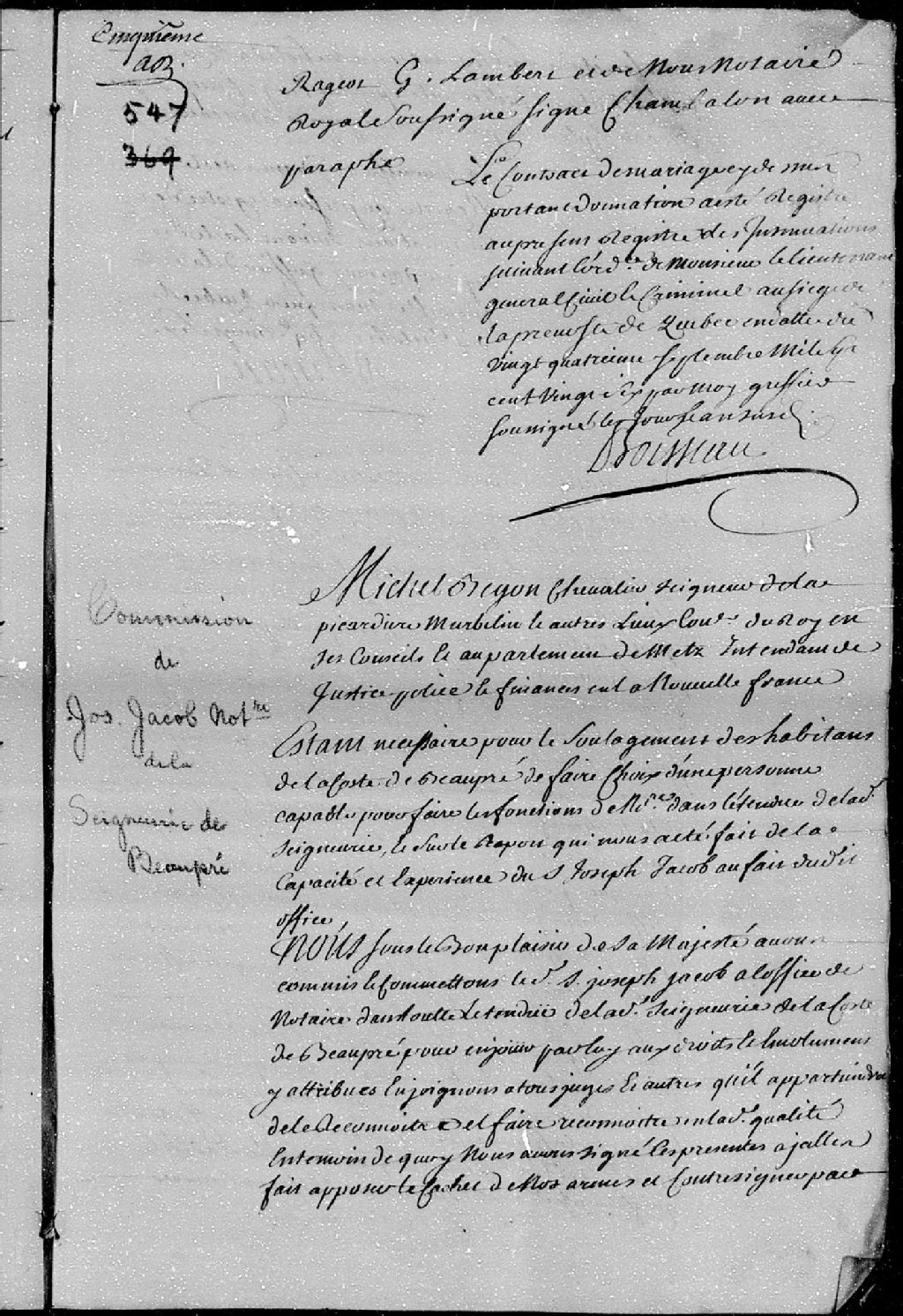 Commission de notaire dans toute l'étendue de la seigneurie de la Côte-de-Beaupré, accordée à Joseph Jacob, par l'intendant Michel Bégon, 28 juillet 1725 [Document insinué le 10 octobre 1726], Archives nationales à Québec, Fonds Cour supérieure. District judiciaire de Québec. Insinuations, (03Q,CR301,P1153).