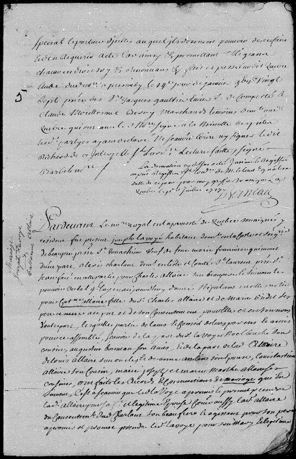 Contrat de mariage passé pardevant maître Barbel, notaire royal en la Prévôté de Québec, entre Joseph Lavoie, habitant demeurant en la côte et seigneurie de Beaupré, paroisse Saint-Joachim, veuf de feue Marie-Françoise Guimont (Guimond); et Catherine Allaire, fille de Charles Allaire et de Marie Bidet, ses père et mère, stipulant par Alexis Charland, demeurant en l'île et comté de Saint-Laurent, paroisse Saint-Jean, donnant son consentement en lieu et place de Charles Allaire, son beau-père, 18 novembre 1726 [Document insinué le 1 er juillet 1727], Archives nationales à Québec, Fonds Cour supérieure. District judiciaire de Québec. Insinuations, (03Q,CR301,P1181).