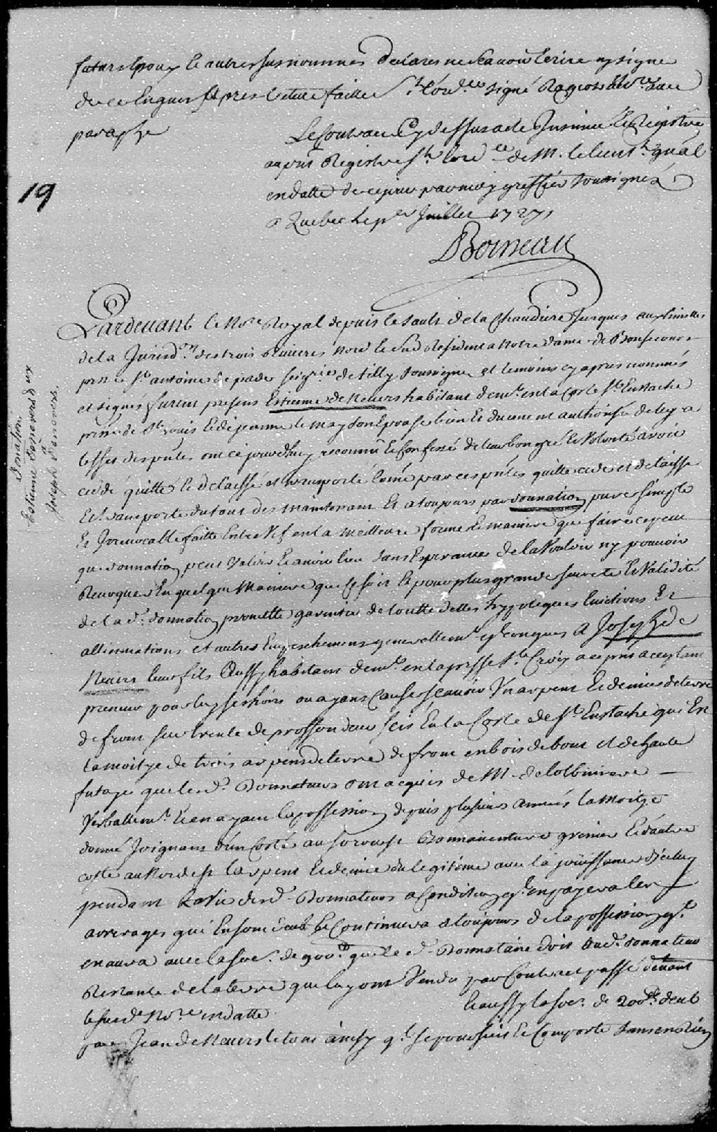 - La pièce se compose de la donation par Étienne Denevers, habitant demeurant en la côte Saint-Eustache, paroisse de Saint-Louis, et Jeanne Lemay, son épouse; à Joseph DeNevers, leur fils, habitant demeurant en la paroisse de Sainte-Croix; à savoir un arpent et demi de terre de front sur trente de profondeur, situé en la côte Sainte-Eustache, dont trois arpents sont en bois debout; ladite donation est passée pardevant maître Dehornay (Dehorné - Dehornais), notaire royal depuis le sault de la Chaudière jusqu'aux limites de la Juridiction royale des Trois-Rivières Nord et Sud.