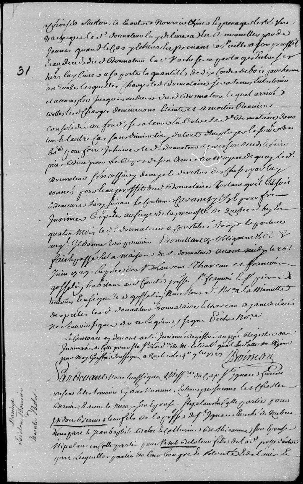 Contrat de mariage passé pardevant maître Pinguet, notaire royal en la Prévôté de Québec, entre Isidore Bernier, fils de Charles Bernier et Anne Lemieux, ses père et mère, de la paroisse de Saint-Ignace, évêché de Québec; et Ursule Belot (Belleau), fille de Jean-Baptiste Belot et de Catherine Berthiaume, du même lieu