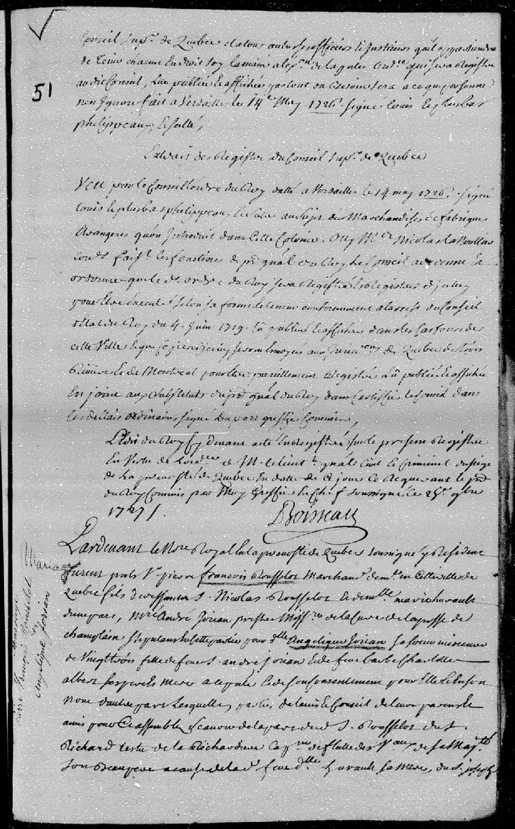Contrat de mariage passé pardevant maître Barbel, notaire royal en la Prévôté de Québec, entre Pierre-François Rousselot, marchand demeurant en la ville de Québec, fils des défunts Nicolas Rousselot et Marie Hurault; et Angélique Jorian, mineure de 23 ans, fille des défunts André Jorian et Barbe-Charlotte Albert, ses père et mère, stipulant par son frère, André Jorian, prêtre faisant les fonctions curiales de la paroisse de Champlain, 25 septembre 1727 [Document insinué le 20 janvier 1728], Archives nationales à Québec, Fonds Cour supérieure. District judiciaire de Québec. Insinuations, (03Q,CR301,P1204).