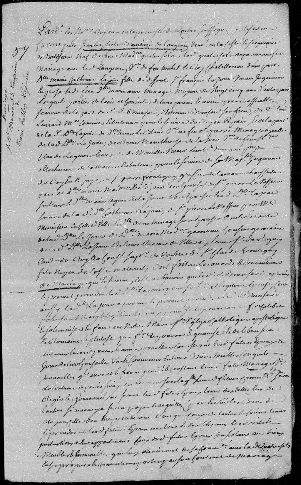 Contrat de mariage passé pardevant maître Barbel, notaire royal en la Prévôté de Québec, entre Jean-Baptiste Bronsard dit Langevin (Bransard), demeurant en la côte et seigneurie de Batiscan, veuf de feue Madeleine Quatresols (Quatresous), auparavant veuve de défunt Michel Roy dit Châtellerault; et Marie-Catherine Lajoue, majeure de 25 ans, fille des défunts François Lajoue, vivant ingénieur, et Marie-Anne Ménage, ses père et mère