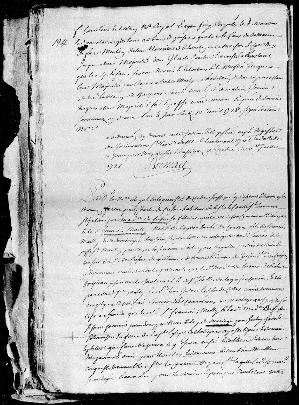 Contrat de mariage passé pardevant maître de LaCetière (La Cetière), notaire royal en la Prévôté de Québec, entre François Mailly, natif de Nérac, évêché de Condom (Guyenne), fils de François Mailly et de Dominique Toussaint, ses père et mère, aubergistes audit lieu, paroisse Saint-Martin; et Madeleine Dufresne, fille de Charles Dufresne, habitant de l'île et comté Saint-Laurent, 1er octobre 1727 [Document insinué le 6 juillet 1728], Archives nationales à Québec, Fonds Cour supérieure. District judiciaire de Québec. Insinuations, (03Q,CR301,P1242).