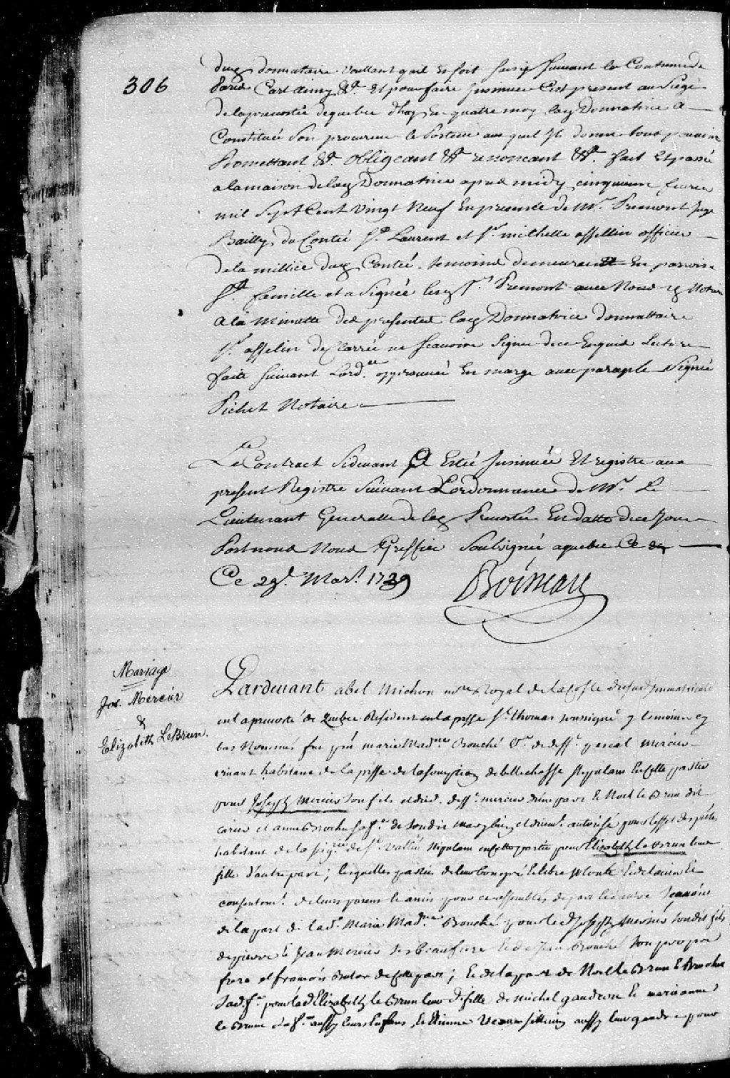 Contrat de mariage passé pardevant Abel Michon, notaire royal en la côte du Sud, entre Joseph Mercier, fils de défunt Pascal Mercier, vivant habitant de la paroisse de L'Assomption-de-Bellechasse, et de Marie-Madeleine Bouché (Boucher), ses père et mère; et Élisabeth Lebrun, fille de Noël Lebrun dit Carier (Carrière) et d'Anne Brochu, demeurant en la seigneurie de Saint-Vallier