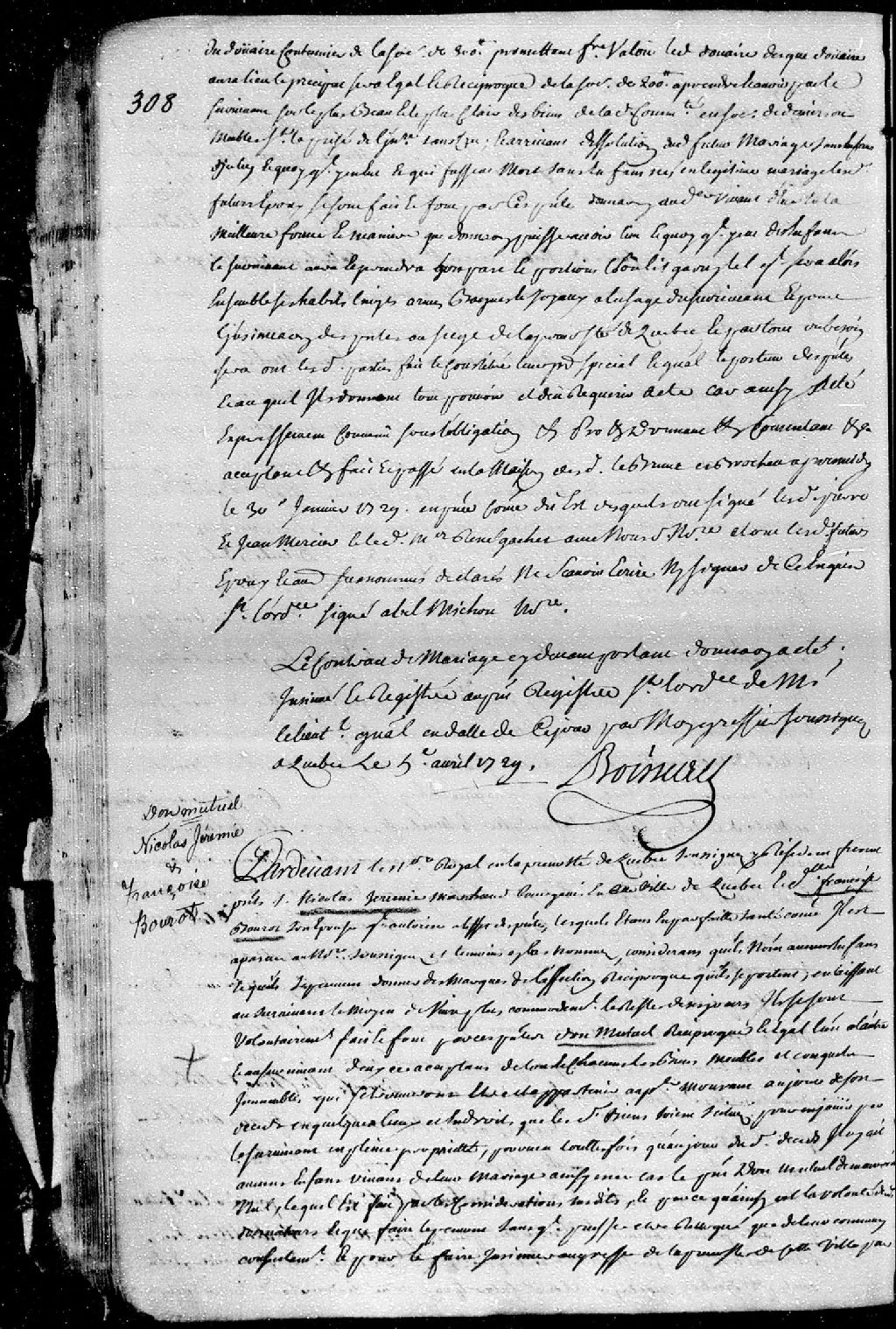 Donation mutuelle entre Nicolas Jérémie, marchand bourgeois de la ville de Québec, et Françoise Bourot, son épouse, de tous leurs biens meubles et immeubles; ladite donation est passée pardevant maître Barbel, notaire royal en la Prévôté de Québec, 22 février 1729 [Document insinué le 24 mai 1729], Archives nationales à Québec, Fonds Cour supérieure. District judiciaire de Québec. Insinuations, (03Q,CR301,P1285).
