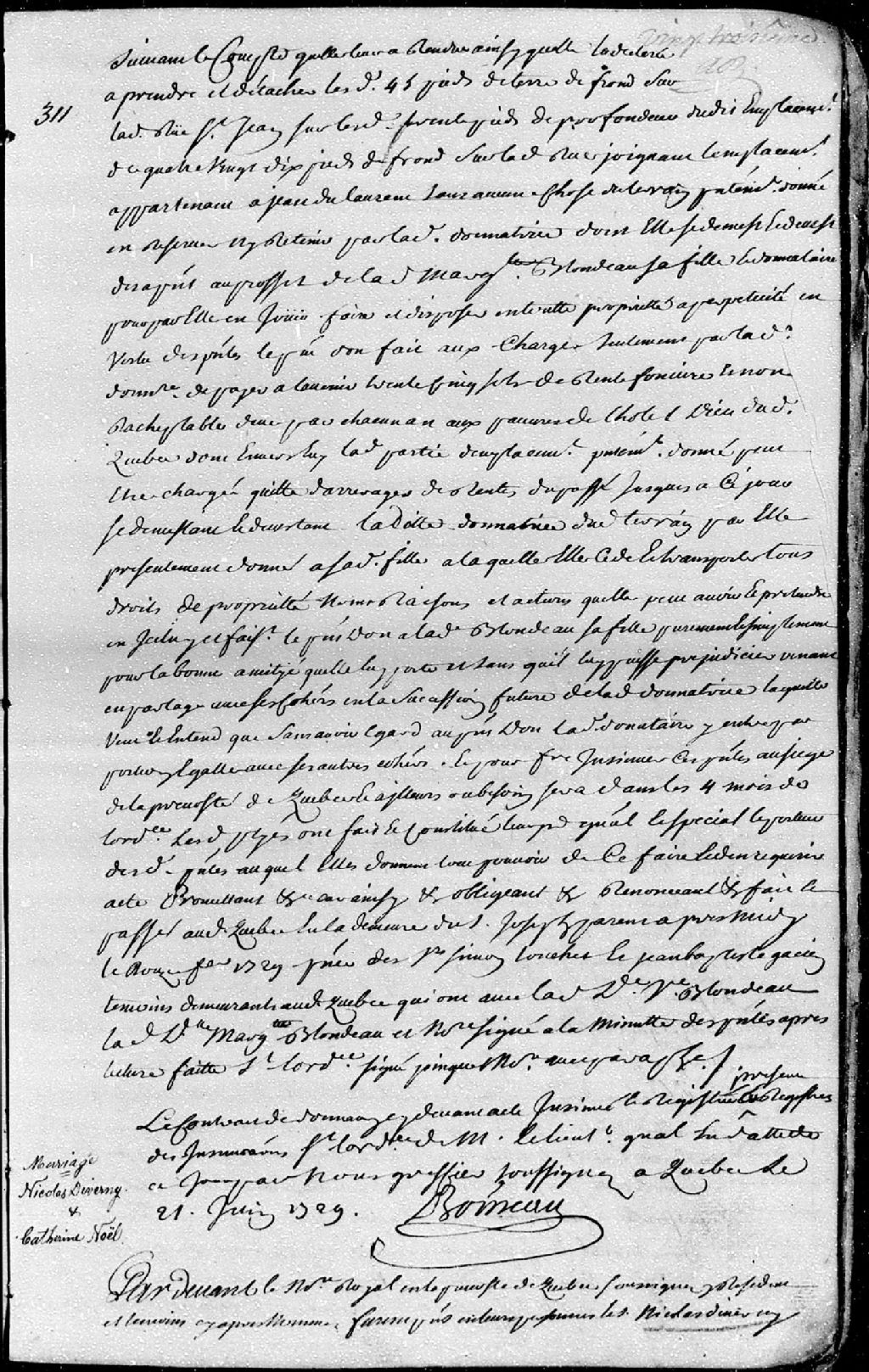 Contrat de mariage passé pardevant maître Dubreuil, notaire royal en la Prévôté de Québec, entre Nicolas Diverny, fils de Jean-Simon Diverny, notaire au Châtelet de la paroisse Saint-Germain, en Saint-Germain-en-Laye, et de Françoise Peltier (Pelletier), ses père et mère; et Catherine-Noël, fille de feu François Noël et de Catherine Brulon, demeurant en la ville de Québec