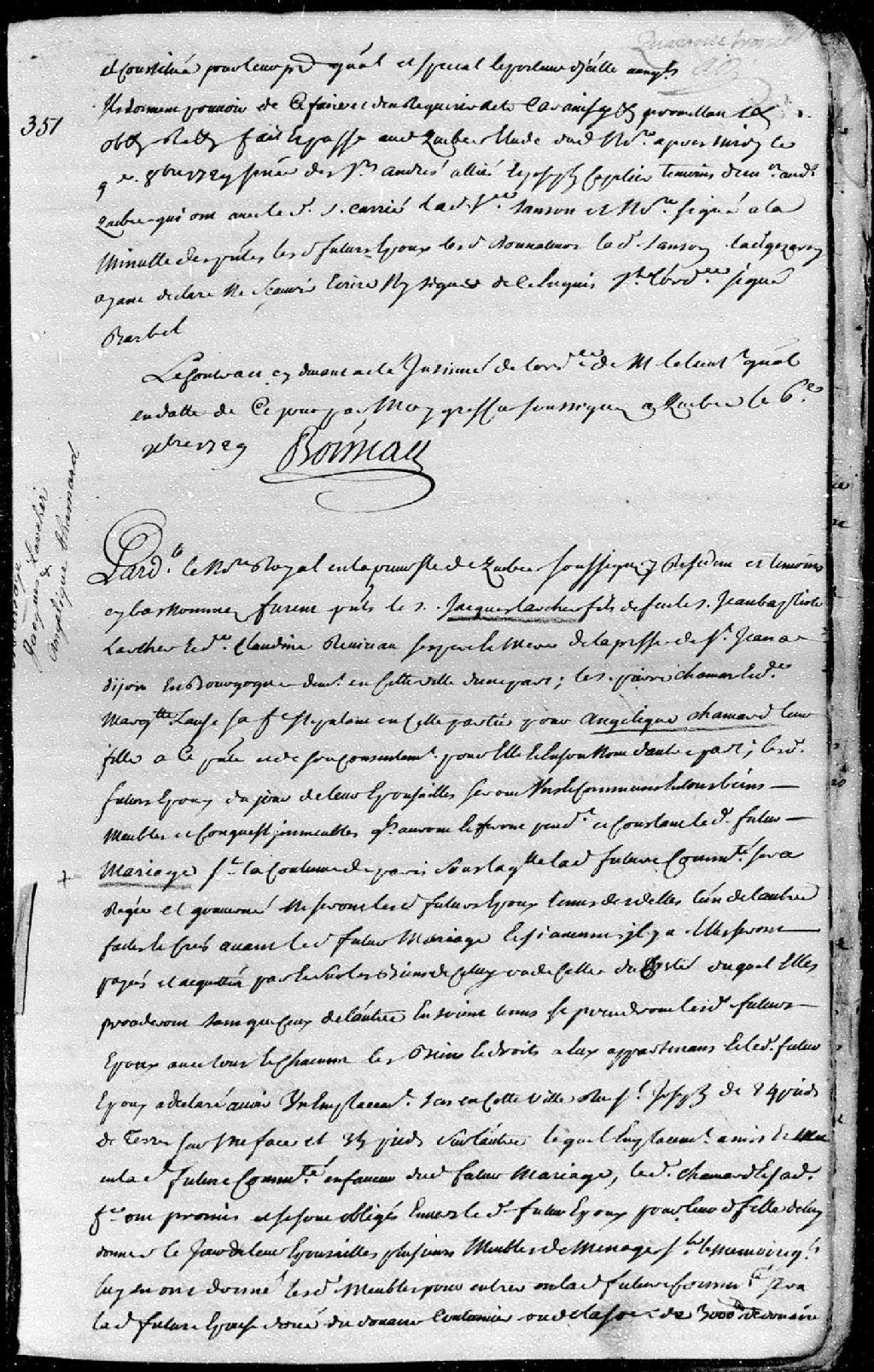 Contrat de mariage passé pardevant maître Pinguet, notaire royal en la Prévôté de Québec, entre Jacques Larcher, fils des défunts Jean-Baptiste Larcher et Claudine Reviriau, ses père et mère, de la paroisse de Saint-Jean à Dijon, en Bourgogne, demeurant en la ville de Québec; et Angélique Chamard, fille de Pierre Chamard et de Marguerite Lauzé, 3 août 1729 [Document insinué le 13 décembre 1729], Archives nationales à Québec, Fonds Cour supérieure. District judiciaire de Québec. Insinuations, (03Q,CR301,P1318).