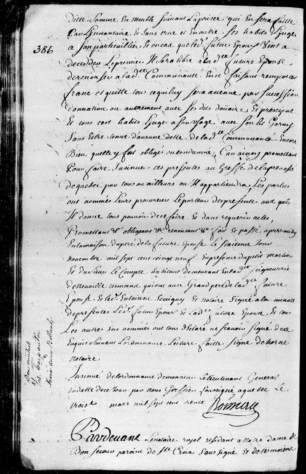 Donation mutuelle entre François Carpentier, habitant demeurant en la seigneurie de Neuville, paroisse de Saint-François-de-Sales, et Marie-Anne Béland, de tous leurs biens meubles et immeubles; ladite donation est passée pardevant maître Dehorné (Dehornay - Dehornais), notaire royal demeurant à Notre-Dame-de-Bonsecours, paroisse de Sainte-Croix, 7 novembre 1729 [Document insinué le 3 mars 1730], Archives nationales à Québec, Fonds Cour supérieure. District judiciaire de Québec. Insinuations, (03Q,CR301,P1334).