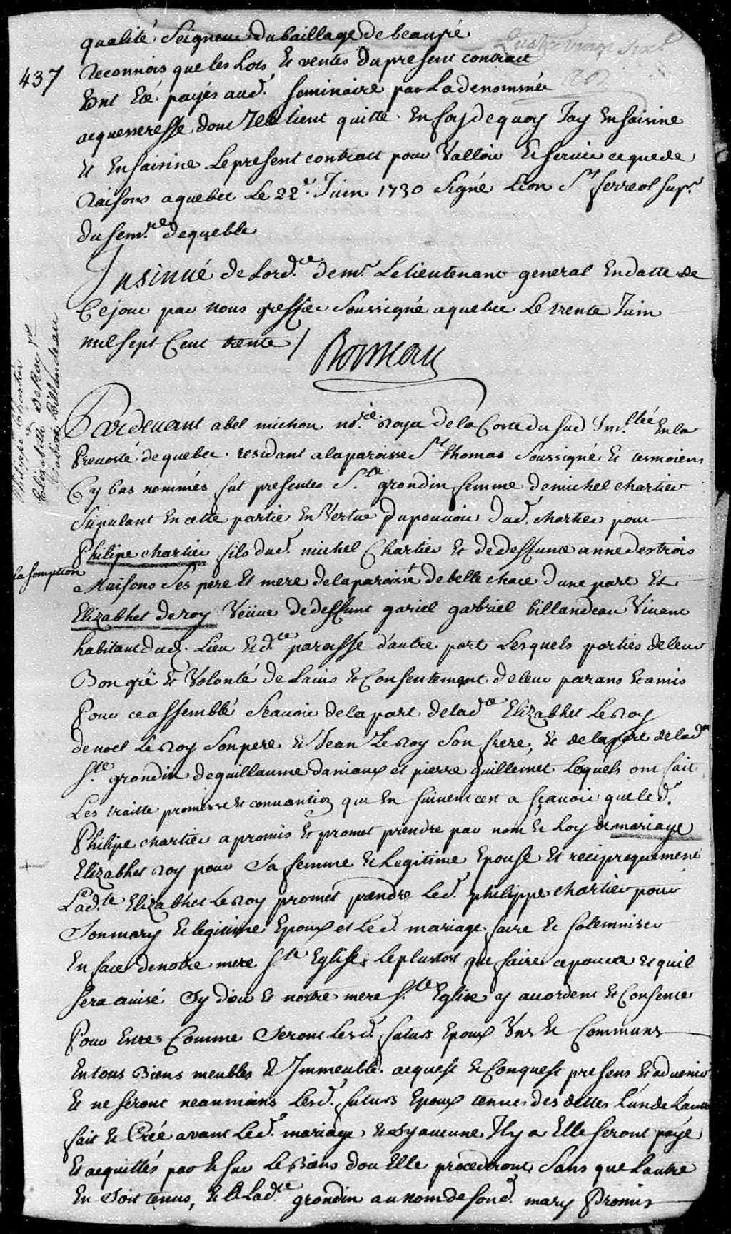 Contrat de mariage passé pardevant Abel Michon, notaire royal en la côte du Sud, entre Philippe Chartier, fils de défunte Anne Destroismaisons et de Michel Chartier, ses père et mère, de la paroisse de L'Assomption de Bellechasse, stipulant par Sainte Grondin, épouse en troisièmes noces dudit Michel Chartier, d'une part; et Élisabeth Leroy (Roy), fille de Noël Leroy, veuve de feu Gabriel Billandeau (Bilodeau), vivant habitant dudit lieu, d'autre part, 6 avril 1730 [Document insinué le 4 juillet 1730], Archives nationales à Québec, Fonds Cour supérieure. District judiciaire de Québec. Insinuations, (03Q,CR301,P1354).