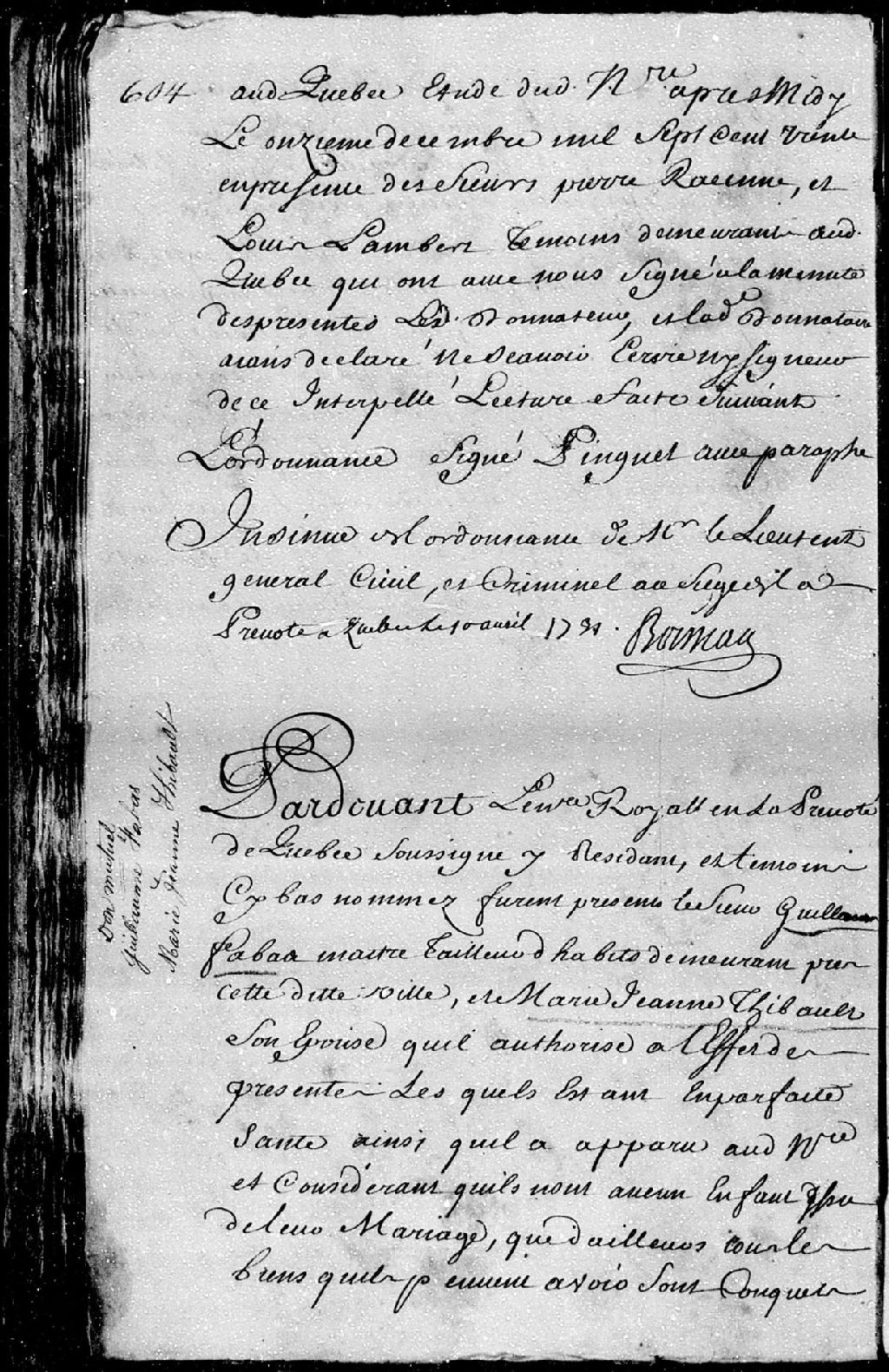 Donation mutuelle et réciproque entre Guillaume Fabas (dit Saint-Germain), maître tailleur demeurant en la ville de Québec; et Marie-Jeanne Thibault, son épouse, de tous leurs biens meubles et immeubles, considérant l'absence d'enfant issu de leur union; ladite donation est passée pardevant maître Pinguet, notaire royal en la Prévôté de Québec, 6 mars 1731 [Document insinué le 10 avril 1731], Archives nationales à Québec, Fonds Cour supérieure. District judiciaire de Québec. Insinuations, (03Q,CR301,P1408).