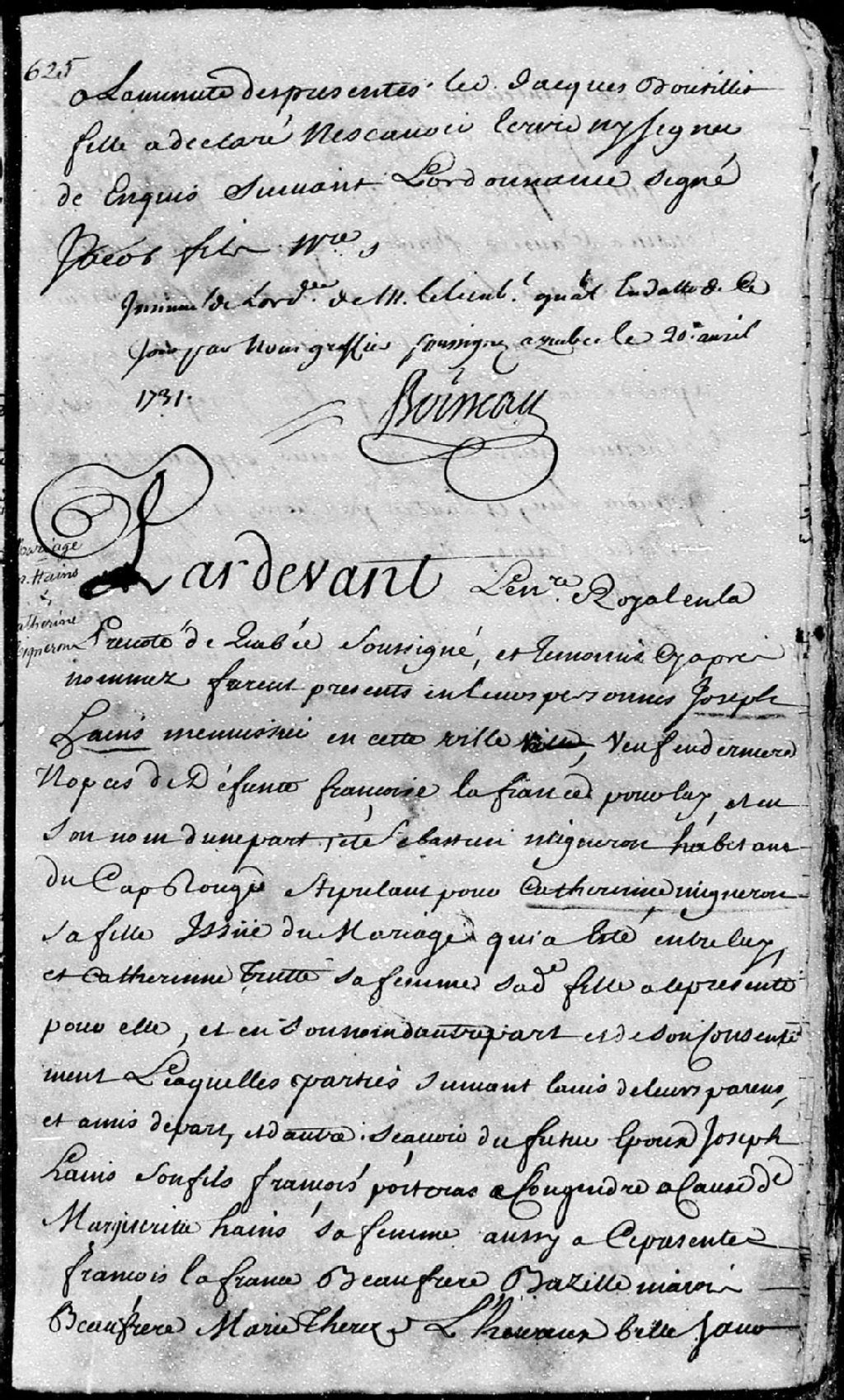 Contrat de mariage passé pardevant maître Dubreuil, notaire royal en la Prévôté de Québec, entre Joseph Hains (Hins), menuisier en la ville de Québec, veuf en dernières noces de défunte Françoise Lafrance (Pinel dit Lafrance); et Catherine Migneron, fille de Sébastien Migneron, habitant de Cap-Rouge, et de Marie-Catherine Trutte (Tru), ses père et mère, 14 janvier 1731 [Document insinué le 24 avril 1731], Archives nationales à Québec, Fonds Cour supérieure. District judiciaire de Québec. Insinuations, (03Q,CR301,P1414).