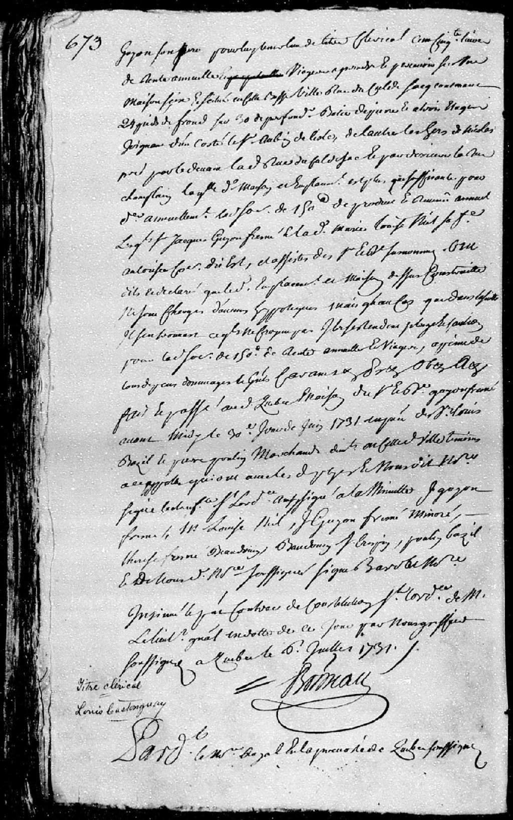 Titre clérical accordé à Louis Castonguay, clerc acolyte demeurant au Séminaire de Québec, pardevant maître Dubreuil, notaire royal en la Prévôté de Québec, 6 juillet 1731 [Document insinué le 13 juillet 1731], Archives nationales à Québec, Fonds Cour supérieure. District judiciaire de Québec. Insinuations, (03Q,CR301,P1436).
