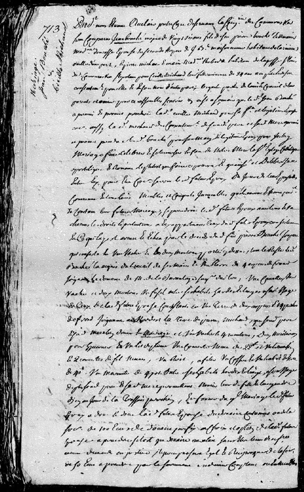 Contrat de mariage passé pardevant Étienne Auclair, prêtre curé desservant la seigneurie de Kamouraska, entre Jean Boucher, majeur de 26 ans, fils de feu Pierre Boucher et de Marie-Madeleine Dancosse, épouse en secondes noces de Jean-Baptiste Maisonneuve, habitant de la Rivière-Ouelle, d'une part; et Cécile Michaud, mineure de 24 ans, fille de Pierre Michaud et de Marie-Madeleine Thibodeau, habitant de la paroisse Saint-Louis-de-Kamouraska, d'autre part