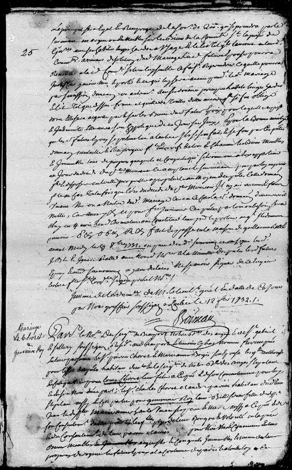 Contrat de mariage passé pardevant maître Duprac (Dupras - Duprat), notaire des seigneuries de Beauport, Saint-Gabriel, Sillery et Notre-Dame-des-Anges, entre Louis Choret, fils de Pierre Choret et Marie-Anne Bogis (Marie-Françoise Baugis), ses père et mère, habitants demeurant en la seigneurie de Notre-Dame-des-Anges; et Geneviève Roy, fille des défunts Jean Roy et Marie-Anne Hot, stipulant par Charles Choret et André Parent, ses beaux-frères, habitants dudit lieu
