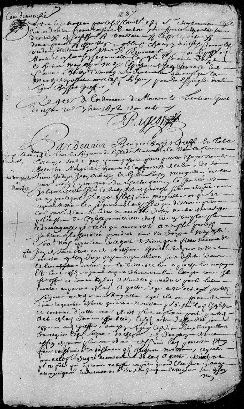 La pièce se compose de l'échange entre la Fabrique de Montréal représentée par Pierre Picoté, écuyer, sieur de Bellestre (Belestre), marguillier d'honneur de la paroisse de Montréal, les sieurs Pierre Gadoy (Gadois), Jean Aubuchon et Gilles Lauzon, tous marguilliers de la paroisse de Montréal, afin d'obtenir un nombre de terre suffisant pour construire une église paroissiale, une terre est octroyée par Jacques Lemoyne (Lemoine), tuteur stipulant pour Agathe de Saint-Père, fille mineure du feu Jean de Saint-Père et de Mathurine Gaudé (Godé - Goddé), sont aussi mentionné Nicolas Godé fils, charpentier et habitant de Montréal, oncle paternel de ladite Agathe, Jean Desrochers, habitant de Montréal et Françoise Godé,sa femme, oncle par alliance et tante paternelle de ladite Agathe, le sieur Pierre Gadoin (Godin - Godé) et Jean-Baptiste Gadoin (Godin - Godé), cousins maternels de ladite Agathe, sont présent et aussi messire François Dollier [...]