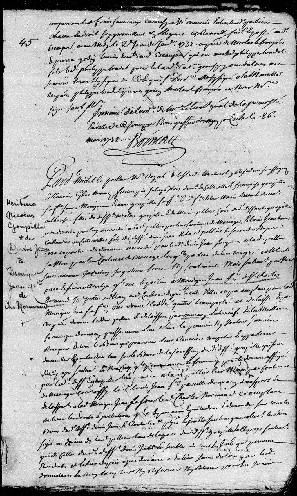 - Donation par les héritiers de Nicolas Goupil et de Marie Peltier (Pelletier); et par Louis-Jean Denis, fils et héritier de Denis Jean et de ladite Marie Peltier; à Monique Jean, épouse de Charles Normand; à savoir tous les droits et prétentions des donateurs dans les biens issus des successions des défunts Nicolas Goupille, Denis Jean et Marie Peltier.