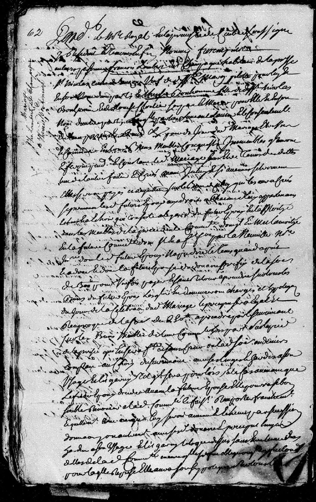 Contrat de mariage passé pardevant maître Dubreuil, notaire royal en la Prévôté de Québec, entre François Lambert dit Champagne, habitant de la paroisse Saint-Nicolas, en la côte de Lauzon, veuf de défunte Marguerite Pilotte (Pilote); et Thérèse Bonhomme, fille de défunt Nicolas Bonhomme et de Louise Cloutier, ses père et mère