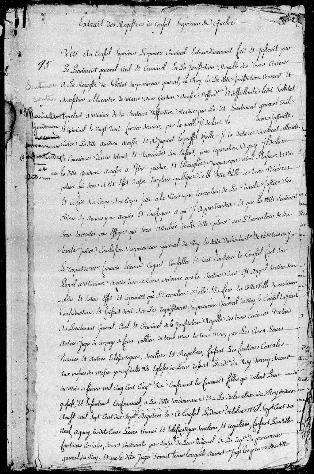 Ordonnance du Conseil Supérieur de Québec enjoignant que la sentence en appel à minimâ de Marie-Anne Gendron, accusée de s'être pendue et étranglée (suicide) et condamnée d'avoir détruit et homicidé son enfant (infanticide), sera effective, soit à une potence qui sera dressée en place publique et de ce fait son corps jeté à la voirie par l'exécuteur de la Haute justice, sauf que l'exécution de celle-ci se fera à Québec au lieu des Trois-Rivières.