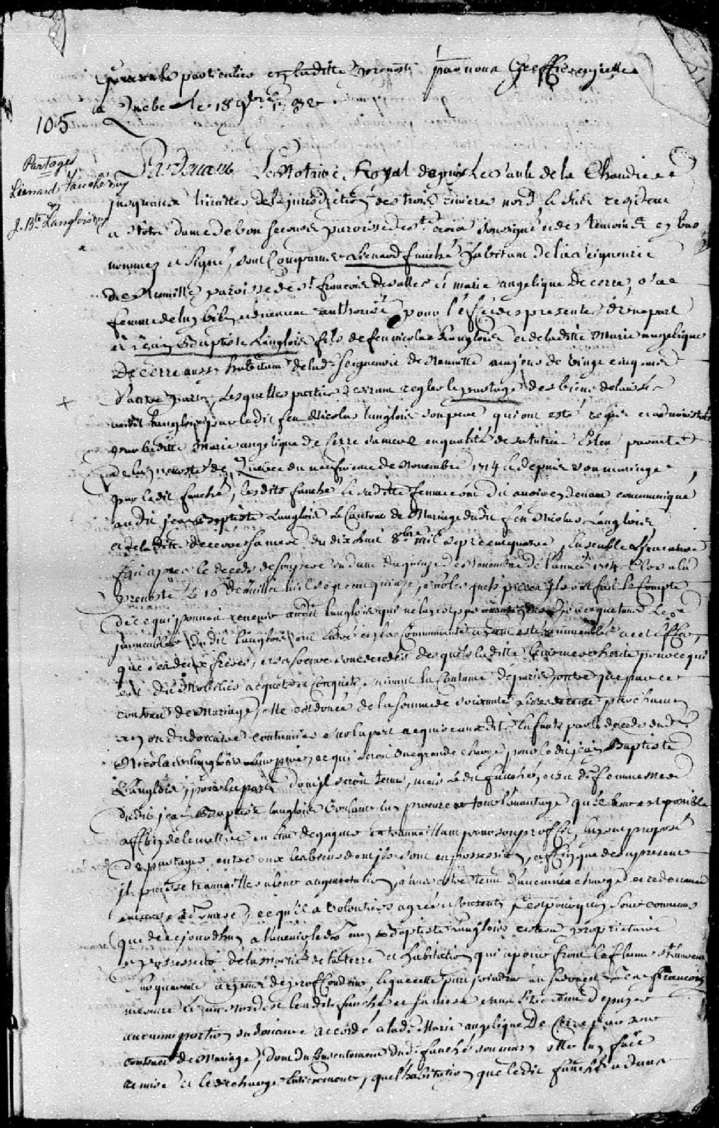 - Acte de partage des biens délaissés par feu Nicolas Langlois, entre Léonard Faucher, habitant de la seigneurie de Neuville, et Marie-Angélique Dessere, sa femme, veuve en première noces dudit Nicolas Langlois; et Jean-Baptiste Langlois, majeur de 25 ans, fils de feu Nicolas Langlois et de Marie-Angélique Decerre (Desere), aussi habitant de la seigneurie de Neuville.