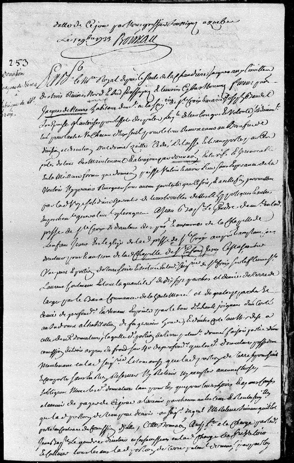 - La pièce se compose de la donation par Jacques de Nevers (Denevers), habitant demeurant en la seigneurie de Sainte-Croix, et Marie-Josèphe Baudet, sa femme; à Jean-Baptiste Legendre, demeurant en ladite paroisse, au nom et comme directeur des aumônes de la Chapelle de l'Enfant-Jésus, en l'église dudit lieu de Sainte-Croix; à savoir une part et portion de terre sise et située en la seigneurie de Sainte-Croix, sur le bord du fleuve Saint-Laurent; ladite donation est passée pardevant maître Choret, notaire royal depuis le sault de la Chaudière jusqu'aux limites de la Juridiction royale des Trois-Rivières Nord et Sud.