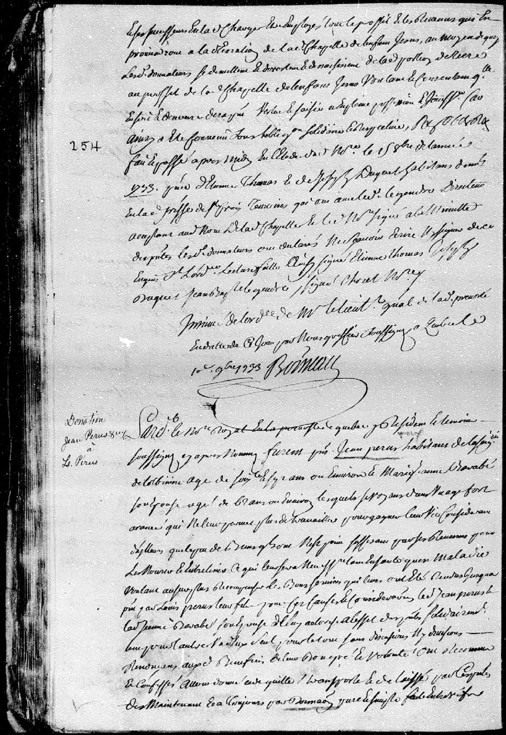 Donation par Jean Perus (Pérusse), habitant de la seigneurie de Lotbinière, et Marie-Jeanne Barabé, son épouse, âgés respectivement de 67 et 62 ans; à Louis Perus, leur fils; à savoir une terre sise et située en la seigneurie de Lotbinière, avec une maison de bois et des meubles; ladite donation est passée pardevant maître Pinguet, notaire royal en la Prévôté de Québec, 16 octobre 1733 [Document insinué le 17 novembre 1733], Archives nationales à Québec, Fonds Cour supérieure. District judiciaire de Québec. Insinuations, (03Q,CR301,P1603).
