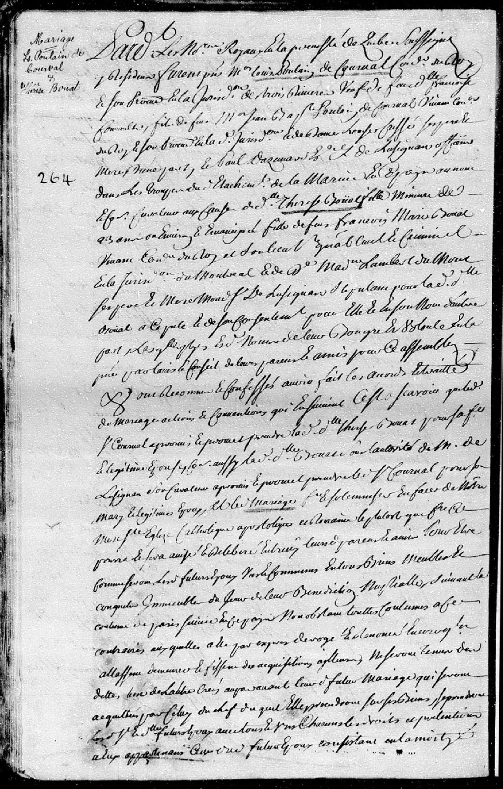 - Contrat de mariage entre Louis Poulain (Poulin) de Courval, veuf de feue Françoise-Gabrielle Foucault, et Thérèse Bouat, mineure de vingt-trois ans.