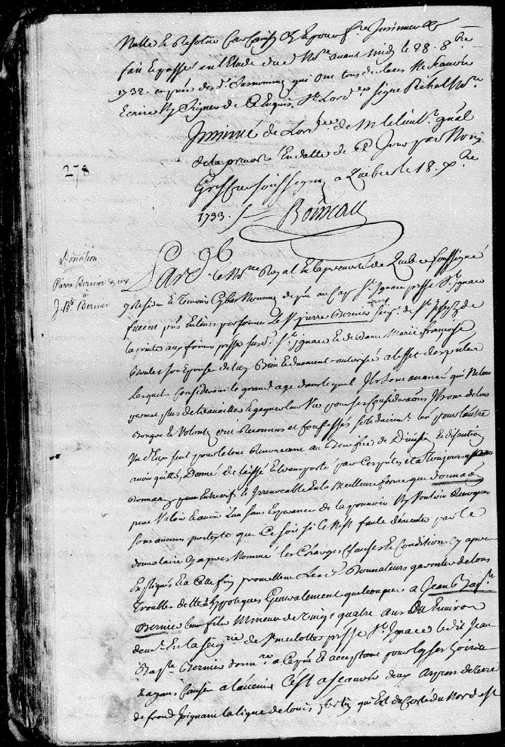 - La pièce se compose de la donation par Pierre Bernier, seigneur de Saint-Joseph-de-la Pointe-aux-Foins, au Cap-Saint-Ignace, et Marie-Françoise Boulet (Boulay), sa femme; à Jean-Baptiste Bernier, leur fils mineur de vingt-quatre ans, demeurant en la seigneurie de Vincelotte, paroisse Saint-Ignace; à savoir une terre avec tous les bâtiments qui en dépendent, un cheval et ses harnois, un boeuf, deux vaches, la ferrure d'une charrue, ainsi que la moitié des meubles qui se trouvent dans la maison des donateurs; ladite donation est passée pardevant maître Rageot, notaire royal en la Prévôté de Québec.