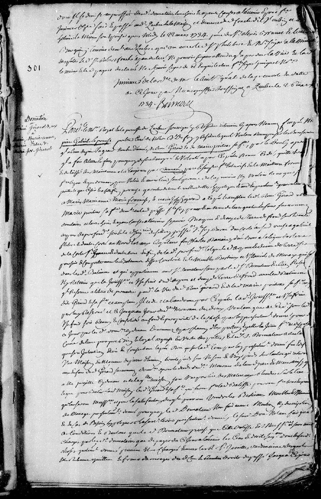 Donation par Pierre-Gabriel Leprévost (Prévost), prêtre curé de Notre-Dame-de-Foy; à René Girard et Marie Poitras, son épouse, demeurant audit lieu, acceptant pour leurs quatre enfants; à savoir une terre sise et située en la seigneurie de Sillery, paroisse Notre-Dame-de-Foy., 17 mars 1734 [Document insinué le 26 mars 1734], Archives nationales à Québec, Fonds Cour supérieure. District judiciaire de Québec. Insinuations, (03Q,CR301,P1633).