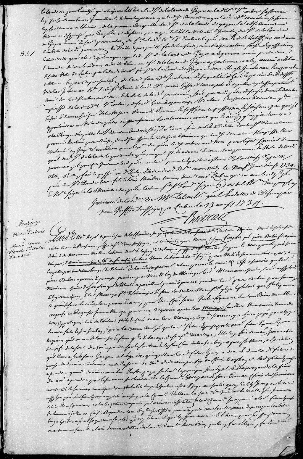 Contrat de mariage passé pardevant maître Choret, notaire royal depuis le sault de la Chaudière jusqu'aux limites de la Juridiction royale des Trois-Rivières Nord et Sud, entre Pierre Dubois, fils de Pierre Dubois et de Marie-Anne Maillou, ses père et mère, habitants demeurant en la seigneurie de Lauzon, paroisse Saint-Nicolas; et Marie-Anne Houde, veuve de défunt Jean-Aubin Lambert (dit Champagne), vivant habitant dudit lieu de Lauzon, 5 janvier 1731 [Document insinué le 13 août 1734], Archives nationales à Québec, Fonds Cour supérieure. District judiciaire de Québec. Insinuations, (03Q,CR301,P1662).