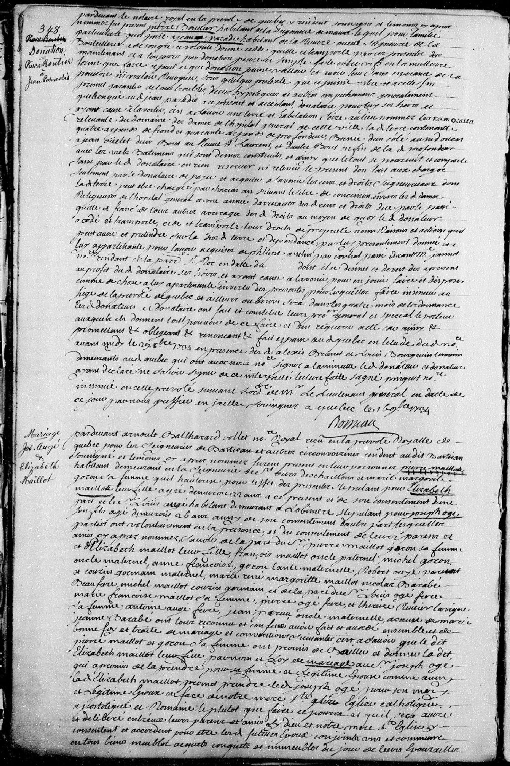 Contrat de mariage passé pardevant Arnould-Balthazar Pollet, notaire royal en la Prévôté de Québec pour les seigneuries de Batiscan, entre Joseph Augé (Auger - Ogé), âgé d'environ 26 ans, fils de Louis Augé, habitant demeurant à Lotbinière, son père; et Élisabeth Maillot, âgée d'environ 22 ans, fille de Pierre Maillot, habitant demeurant en la seigneurie de Saint-Ours-Deschaillons (seigneurie de Deschaillons), et de Marie-Marguerite Goron (Gauron), ses père et mère