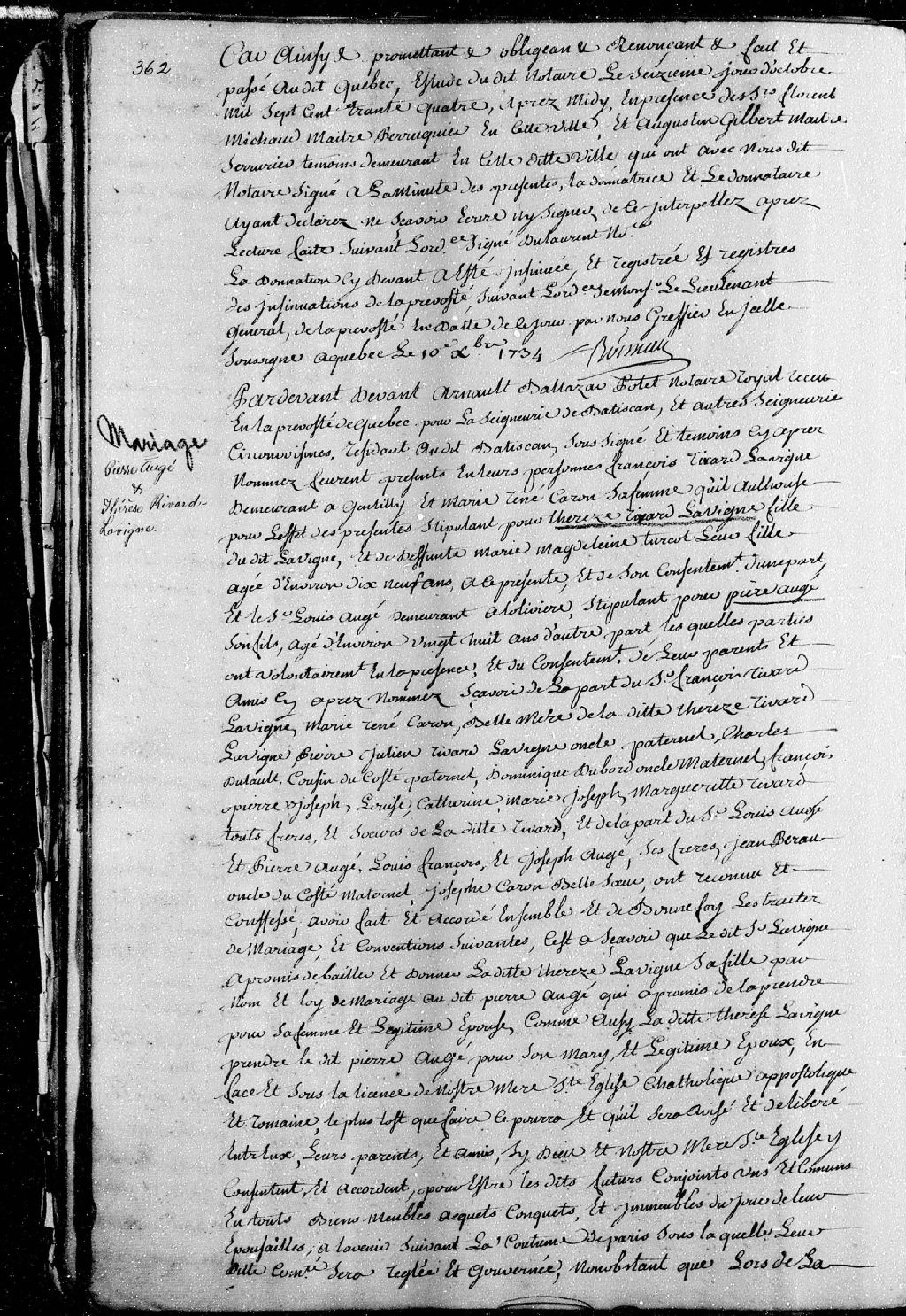 Contrat de mariage passé pardevant Arnould-Balthazar Pollet, notaire royal en la Prévôté de Québec pour les seigneuries de Batiscan et voisines, entre Pierre Augé (Auger), âgé d'environ 28 ans, fils de Louis Augé, demeurant à L'Auberivière; et Thérèse Rivard Lavigne, âgée d'environ 19 ans, fille de défunte Marie-Madeleine Turcot et de François Rivard dit Lavigne, demeurant à Gentilly, époux en secondes noces de Marie-Renée Caron