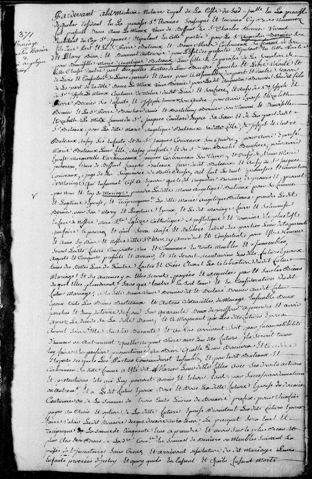 Contrat de mariage passée pardevant Abel Michon, notaire royal de la côte du Sud, entre Augustin Bernier, fils de défunt Charles Bernier, vivant habitant du Cap-Saint-Ignace, et d'Anne Lemieux, ses père et mère; et Marie-Angélique Buteaux (Buteau), fille de Pierre Buteaux et de Marie Carboneaux (Carbonneaux - Carbonneau), ses père et mère, de la paroisse de L'Assomption-de-Bellechasse
