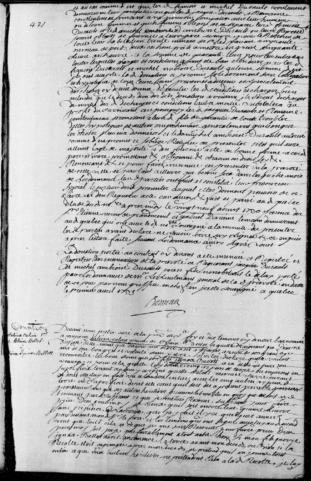 Donation faite en présence du prêtre Leprovost, curé de la paroisse de Sainte-Foy, par Hélène Cailly (Calais), veuve de feu Blaise Bellot (Belleau dit Larose); à Pierre-Ignace Bellot, son fils; à savoir une terre de cinq arpents de superficie, avec une vache, une chaudière et une chamaillère; ladite donation est déposée pardevant maître Boisseau, notaire royal en la Prévôté de Québec, le 5 avril 1735